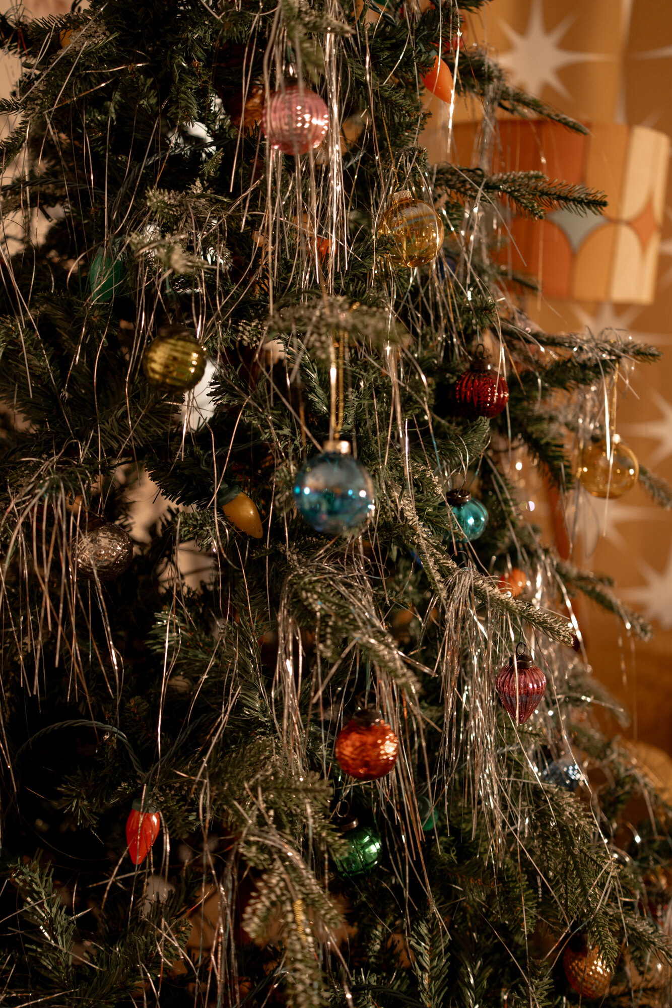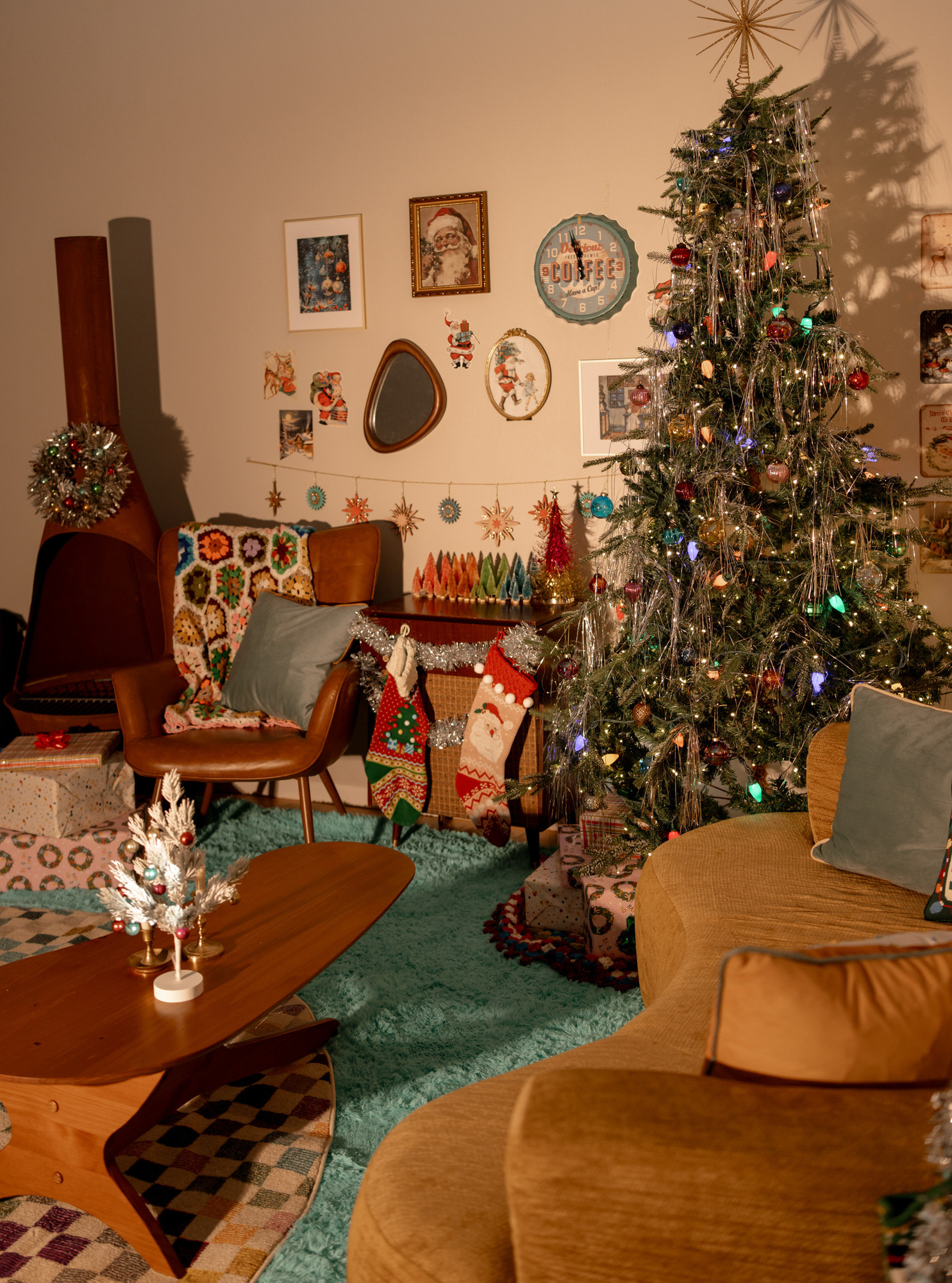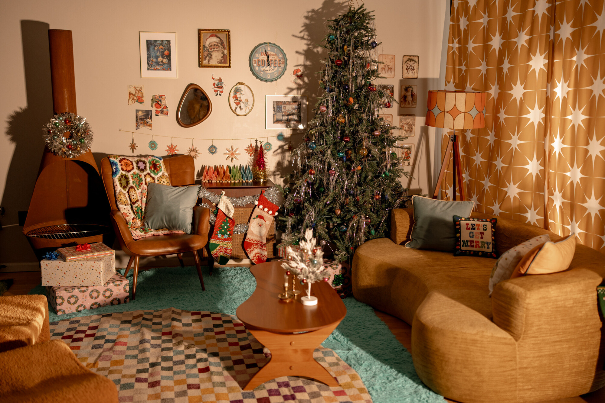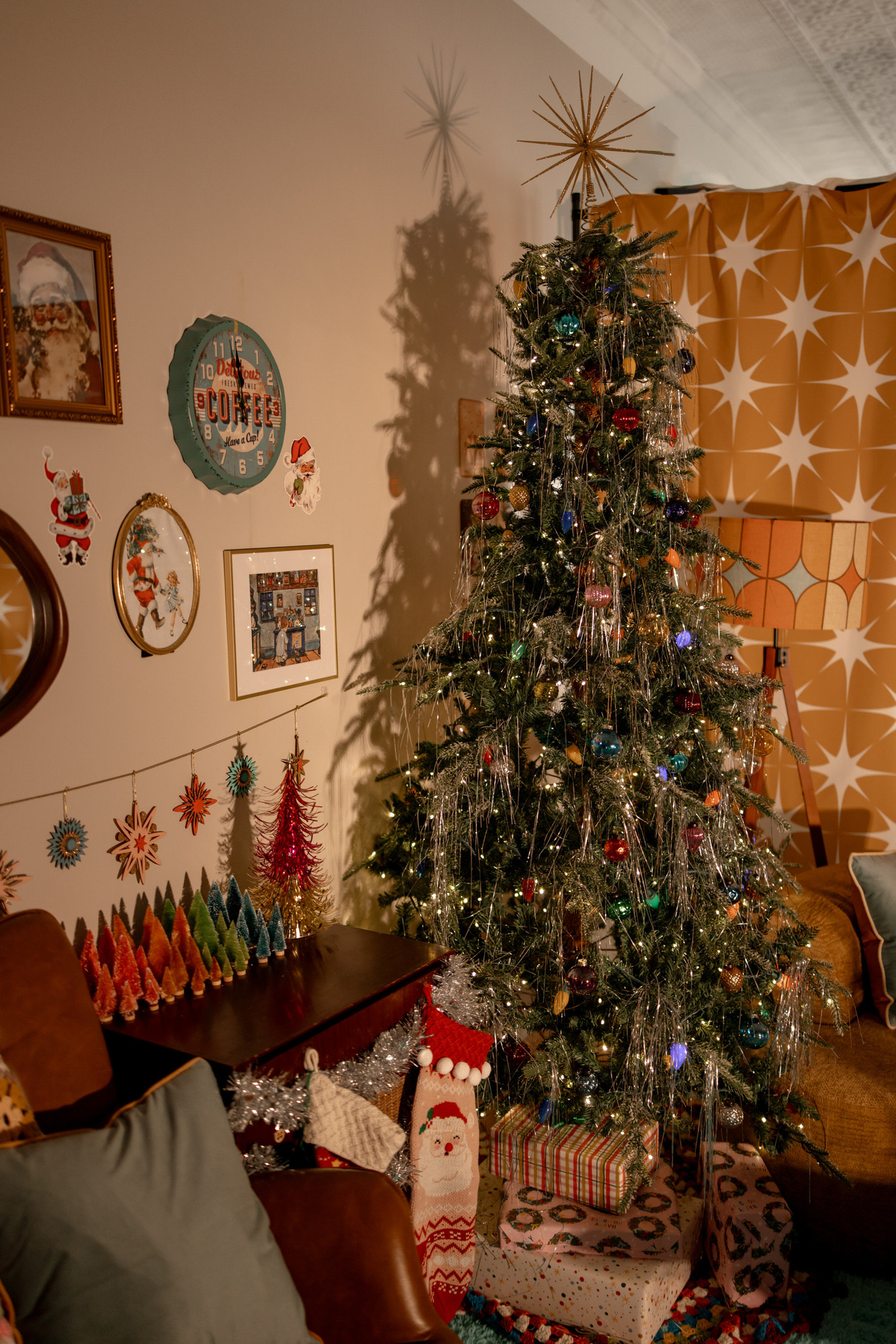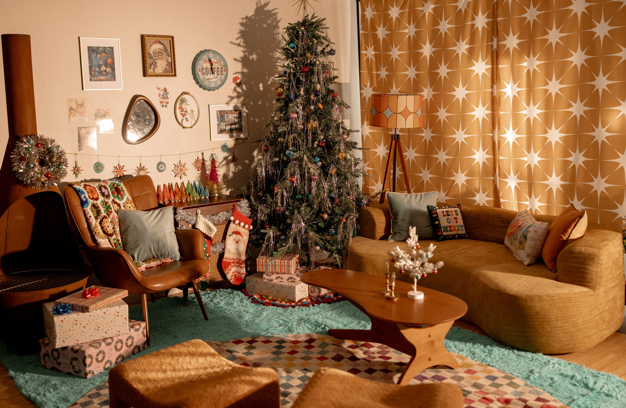 Step into a retro Christmas dream with a tinsel tree and shag carpet!